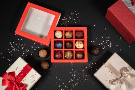 Open gift box with assortment of homemade chocolate bonbons. Modern hand painted chocolate candy. Product concept for chocolatier.