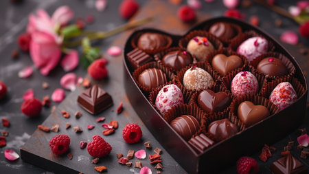 A beautifully arranged box of assorted chocolates showcases various shapes and flavors. Surrounding the box, heart-shaped chocolates add a festive touch, perfect for celebrations.