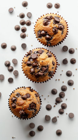 Three chocolate chip muffins with scattered chocolate chips on white background, top view. Dessert and bakery concept