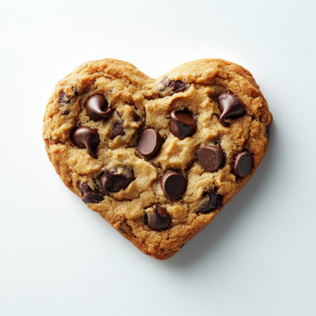 A charming heart-shaped chocolate chip cookie sits on a white surface, perfect for showcasing love and sweetness for any special occasion or celebration.