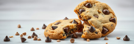 Delicious chocolate chip cookies with pieces broken apart on a white background showcasing dessert perfection