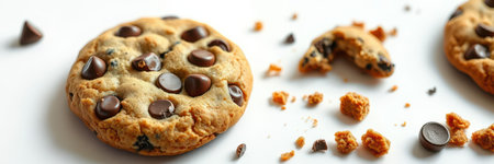 Chocolate chip cookies are arranged in a horizontal line on a white background, creating a visually appealing pattern with scattered crumbs and chocolate chips