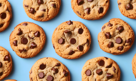 Oatmeal cookies with chocolate chip pattern and patterns on a light blue background. Full screen, top view
