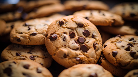 AI Generated. Close-up of a chocolate chip cookie lit by sunlight