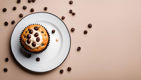 A close-up view of a chocolate chip muffin topped with white frosting, on a white plate against a brown background. The muffin is surrounded by scattered coffee beans.