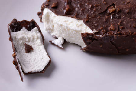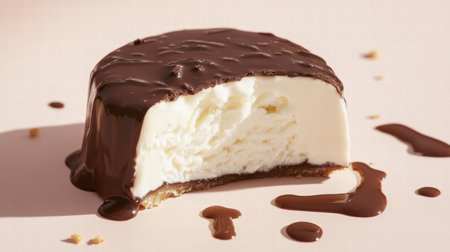 This dessert showcases a velvety white filling encased in a rich chocolate layer, resting on a pale surface, inviting indulgence.