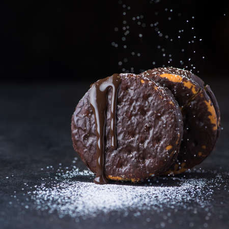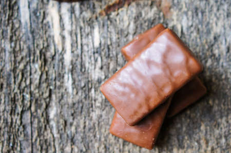 Stack of pieces of chocolate filled with white nougat on a dark stone table, copy space