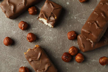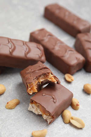 Chocolate bars with caramel, nuts and nougat on light gray table