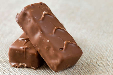 Two isolated isolated dark brown chocolate candy snickers bars on light canvas cloth copy space background. Tasty food, nutritious, snack concept.