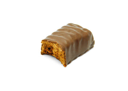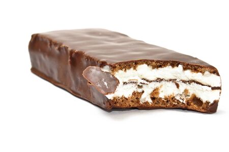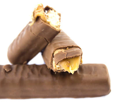 Closeup of chocolate bar with Caramel and Biscuit isolated on white.