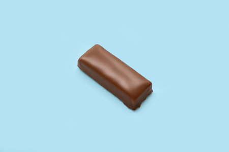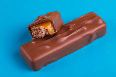 Tasty chocolate bar and half with toffee on bright blue background. Copy space