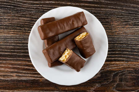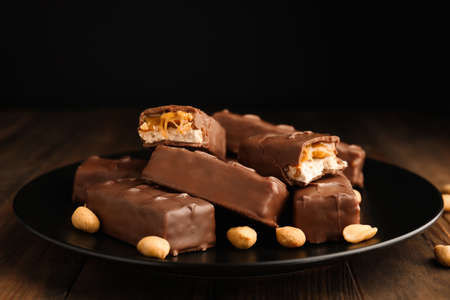 Whole chocolate bars, halves of chocolate bar with caramel and peanut in white plate on dark wooden table. Top view