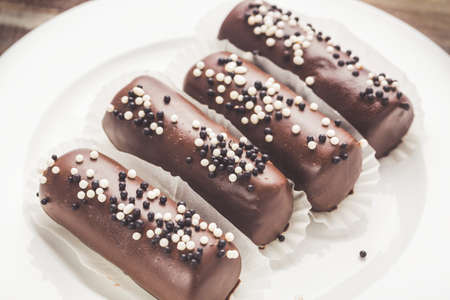 Potato chocolate cakes with sweet balls. Close up toned image with selective focus.