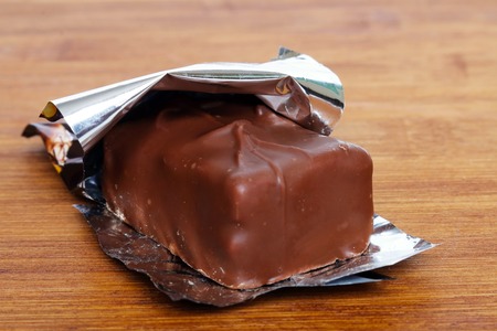 Front view of broken chocolate pieces wrapped in white paper and rustic twine on the white background