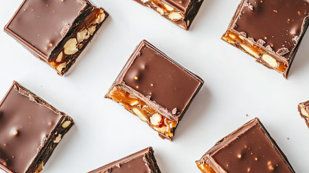 Close-up of a sweet chocolate bar broken into squares, revealing layers of caramel and crunchy nuts inside on a clean white background