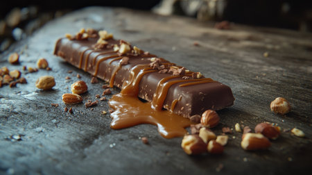 A broken chocolate bar with gooey caramel oozing out and crunchy nuts spilling onto a rustic wooden surface