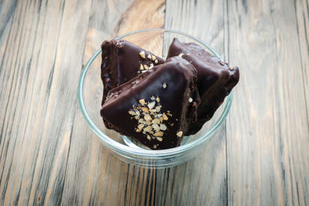 Cakes covered with chocolate glaze in a glass rosette on a wooden table.