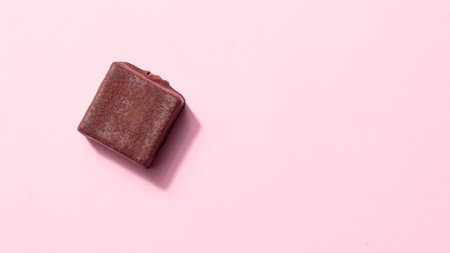 Handcrafted chocolate bonbon. Delicious dessert banner on a pink background with copyspace
