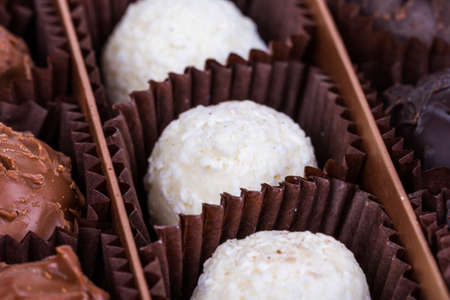 Close up detailed view of yummy tasty white, dark and milky chocolate balls.