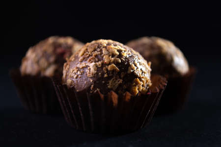 Delicious chocolate candies in waffle crumbs cut in half closeup macro side view
