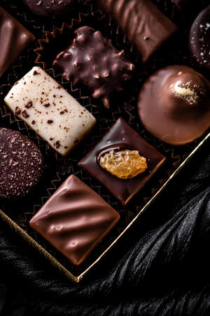 Dark bitter chocolate candies in a box. Dessert is candy. Luxury sweet assortment.