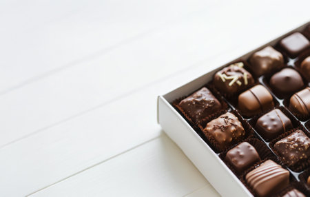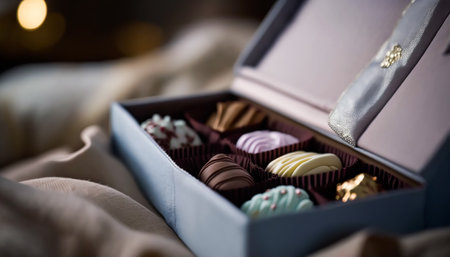 Box of assorted artisan chocolates, golden bokeh, copy space for text. Low depth of field