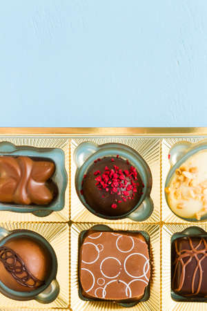Gourmet chocolates in golden box on blue back ground.