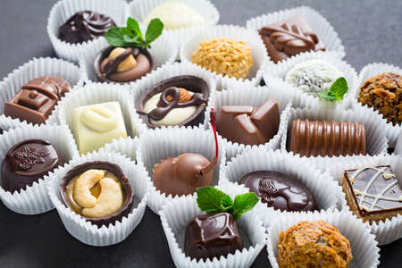 Chocolate candies assortment, closeup view