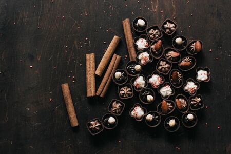 chocolate candies and cinnamon on a brown wooden background. top view
