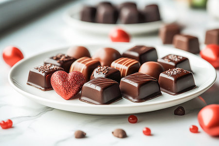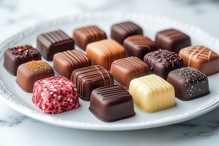 White plate with assortment of Gourmet Chocolates. Special occasion. Premium dessert lovers and luxury food brands.