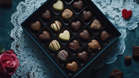 A box of assorted gourmet chocolates in the shape of hearts, resting on a lace doily with soft lighting, perfect for a romantic surprise