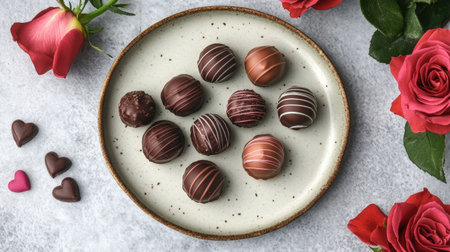 A close-up of milk and dark chocolate Valentine truffles with smooth fillings, arranged in a heart shape on a plate, with a few red roses nearby