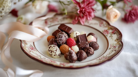 A beautifully presented Valentine chocolate set with various chocolate-covered nuts and fruit, set on a fine china plate with a ribbon and flowers.