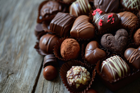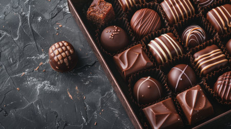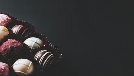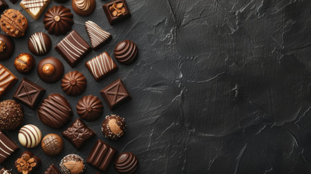 Assorted gourmet chocolates displayed on dark textured surface