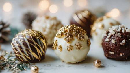 Delight in these elegant gourmet chocolate truffles adorned with gold and white accents, perfect for festive celebrations and seasonal gatherings, set against a stylish marble background.