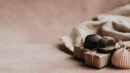 An exquisite arrangement of artisan chocolates paired with rustic packaging on a soft, neutral background, creating an inviting and elegant culinary display for dessert lovers.