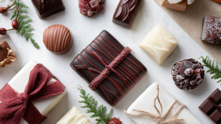 A beautiful arrangement of various gourmet chocolates on a soft linen surface, accented by natural decorations, perfect for festive gatherings and celebrations.