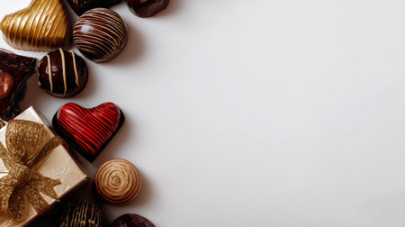 A delightful assortment of chocolates including heart-shaped designs and a beautifully wrapped gift box with a golden ribbon, perfect for holiday celebrations and special moments.