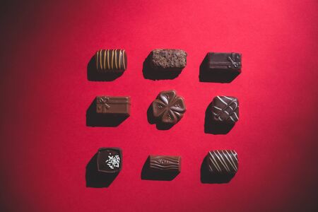 Pralines isolated on red background, deep shadow.sweet and chocolate concept