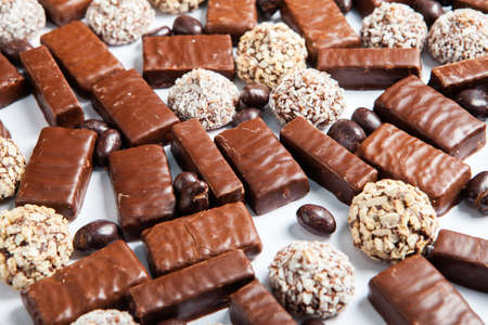 Assortment of delicious chocolate candies background. Chocolate candy isolated