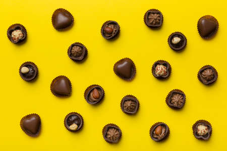 Close-up top view of various chocolate pralines. Sweet food background.