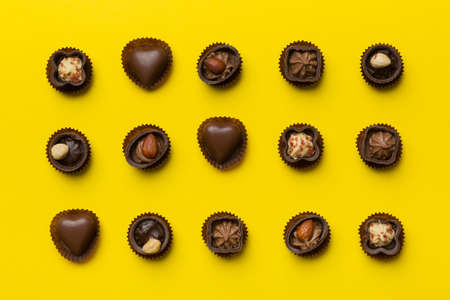 Different kinds of chocolates on colored table close-up. Top View and Flat Lay with copy space.