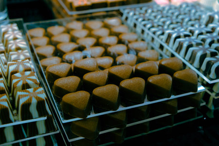 Assortment of dark milk chocolate candies desserts on cafe showcase. Variety of sweets with different flavours nuts in store. Confectionery