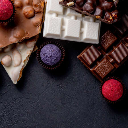 Beautiful Creative Chocolate Sweets on Natural Black Stone Background. Mix of Chocolates Top View and Flat Lay