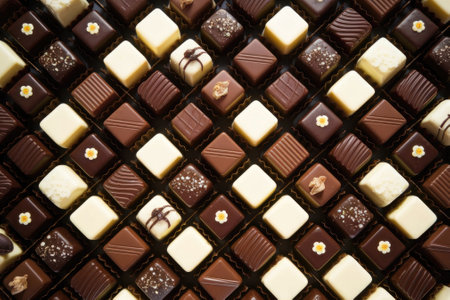 Gourmet chocolate candies filling a box, creating a visually appealing pattern