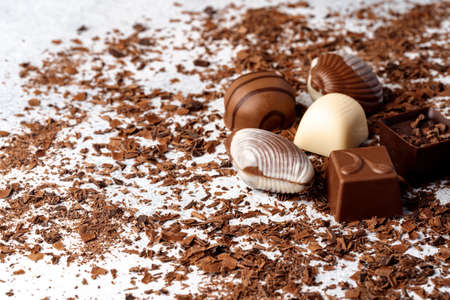 Assortment of delicious chocolate candies and copy space, vertical image.