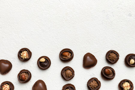 Beautiful Creative Chocolates Candies Background. Chocolate Wallpaper Top View and Flat Lay