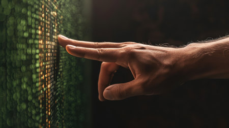 Hand gently touches glowing digital display, symbolizing interaction with technology and data. vibrant colors and intricate patterns evoke sense of innovation and connection