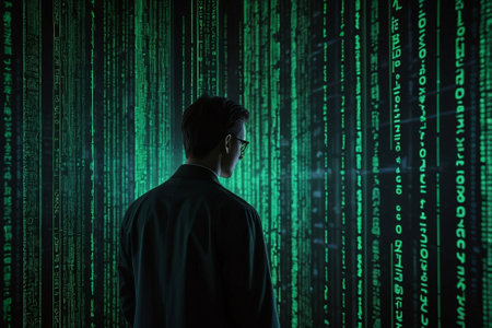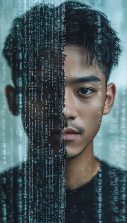 A man's face superimposed with lines of blue numerals and numerical elements.