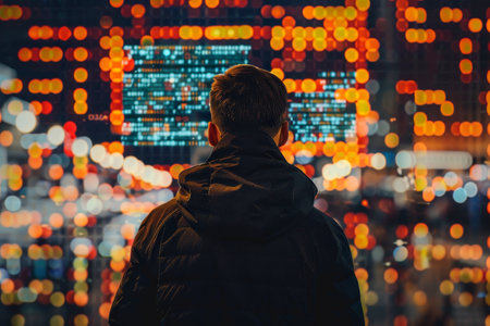 A man standing in front of a city skyline illuminated by lights at night, A data privacy officer ensuring compliance with data protection regulations